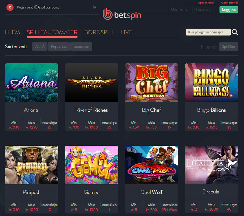Betspin Casino er et helt nytt nettcasino som tilbyr både spill på spilleautomater, kortspill, terningspill og bordspill. Betspin kan faktisk tilby alle typer casinospill du måtte ønske, og disse finnes lett tilgjengelig på casinoets hjemmeside. Dette casinoet har virkelig tatt oss med storm med deres sterke engasjement i å kunne tilby alle typer spillere den beste spillopplevelsen.